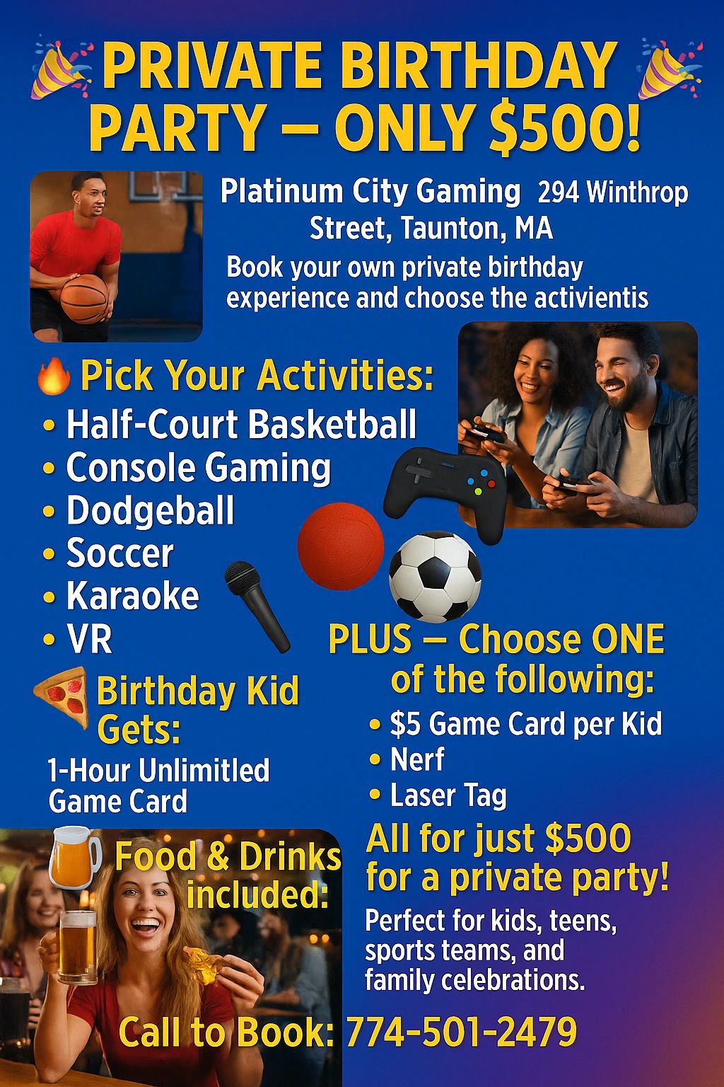 For an exciting kids camp experience, call 774-501-2749. Enjoy a fun-filled day at Platinum City Gaming, perfect for kids' birthday parties. We also offer residential landscaping and 24-hour snow removal services, ensuring your home is ready for any season. Don't miss out on our unique splatter painting events, which are perfect for kids during summer camp!