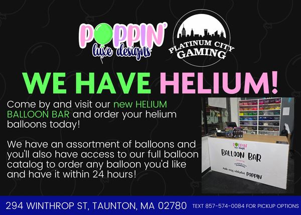 Platinum City Gaming is excited to announce that we now provide helium services and a full balloon store right here at 294 Winthrop Street in Taunton, MA!